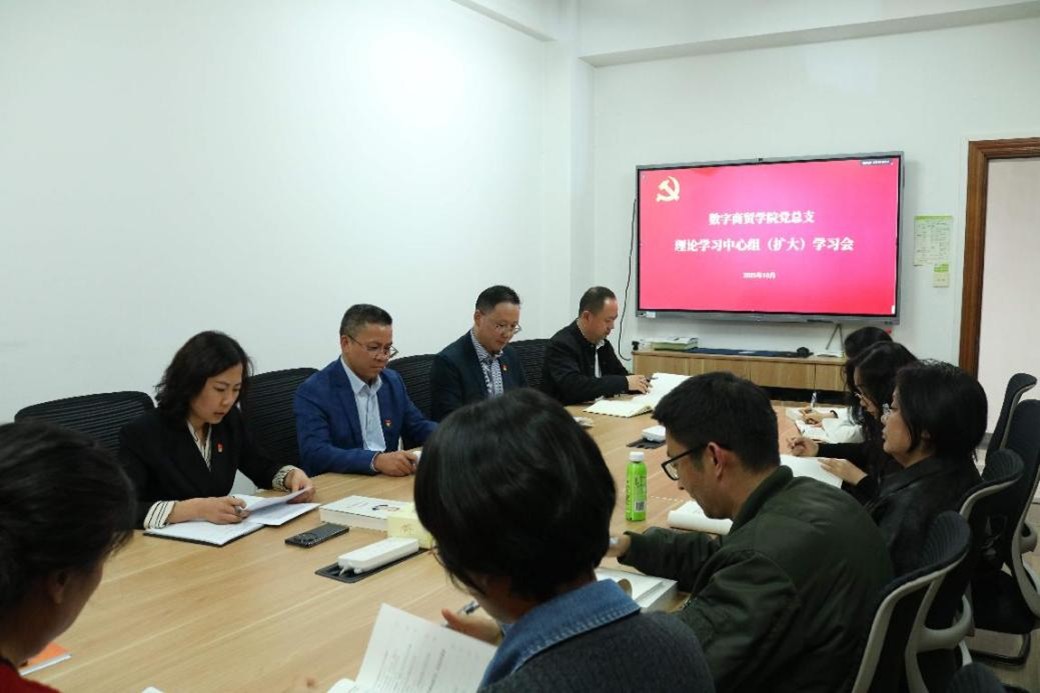 10月28日,数字商贸学院党总支在行政楼1709会议室举行第三季度理论学习中心组(扩大)学习会,专题学习党的二十届四中全会精神与《习近平谈治国理政》第五卷。校党委副书记、校长柯孔林到会指导,学院领导班子成员、党总支委员、各党支部委员参与学习。