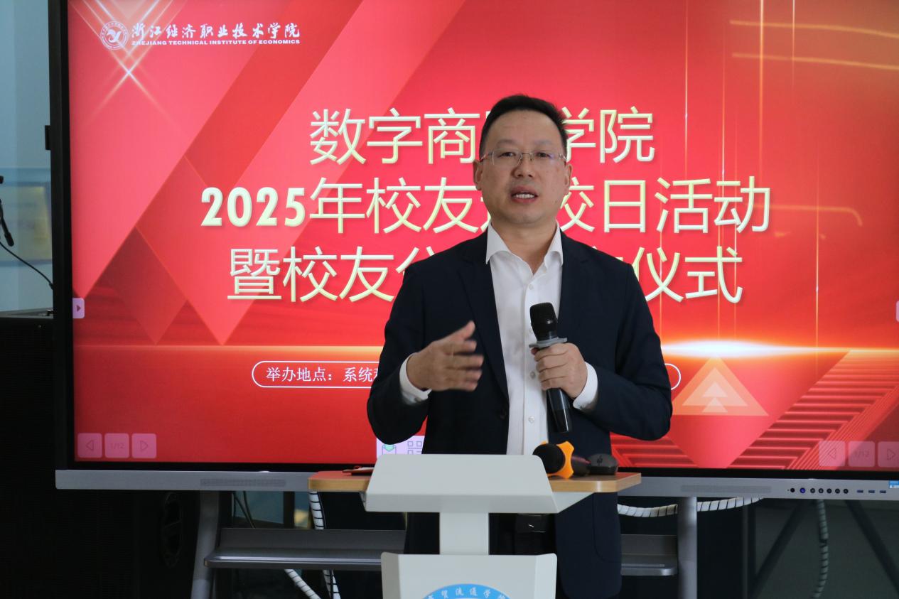 汪永华院长发表致辞,代表学院全体师生向莅临现场的校友们致以热烈欢迎和诚挚感谢。他回顾了数字商贸学院的发展历程与办学成果,分享了学院在专业建设、人才培养、校企合作等方面的显著进展,并展望了未来发展蓝图。他强调,校友是学院最宝贵的财富,校友分会的成立将搭建起学院与校友、校友与校友之间沟通联动的重要平台,希望以此为契机凝聚校友力量,共促学院与校友事业协同发展。