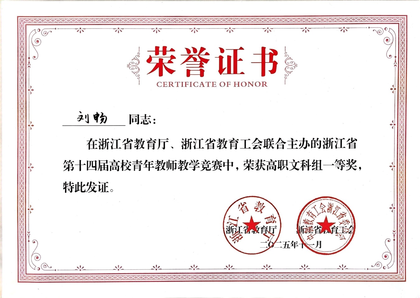 11月17日,浙江省第十四届高校青年教师教学竞赛决赛在宁波大学圆满落幕。数字商贸学院青年教师刘畅,凭借扎实的专业积淀、贴合教学场景的灵动教学设计,以及极具亲和力的课堂互动表现,在激烈竞争中脱颖而出,荣获一等奖。