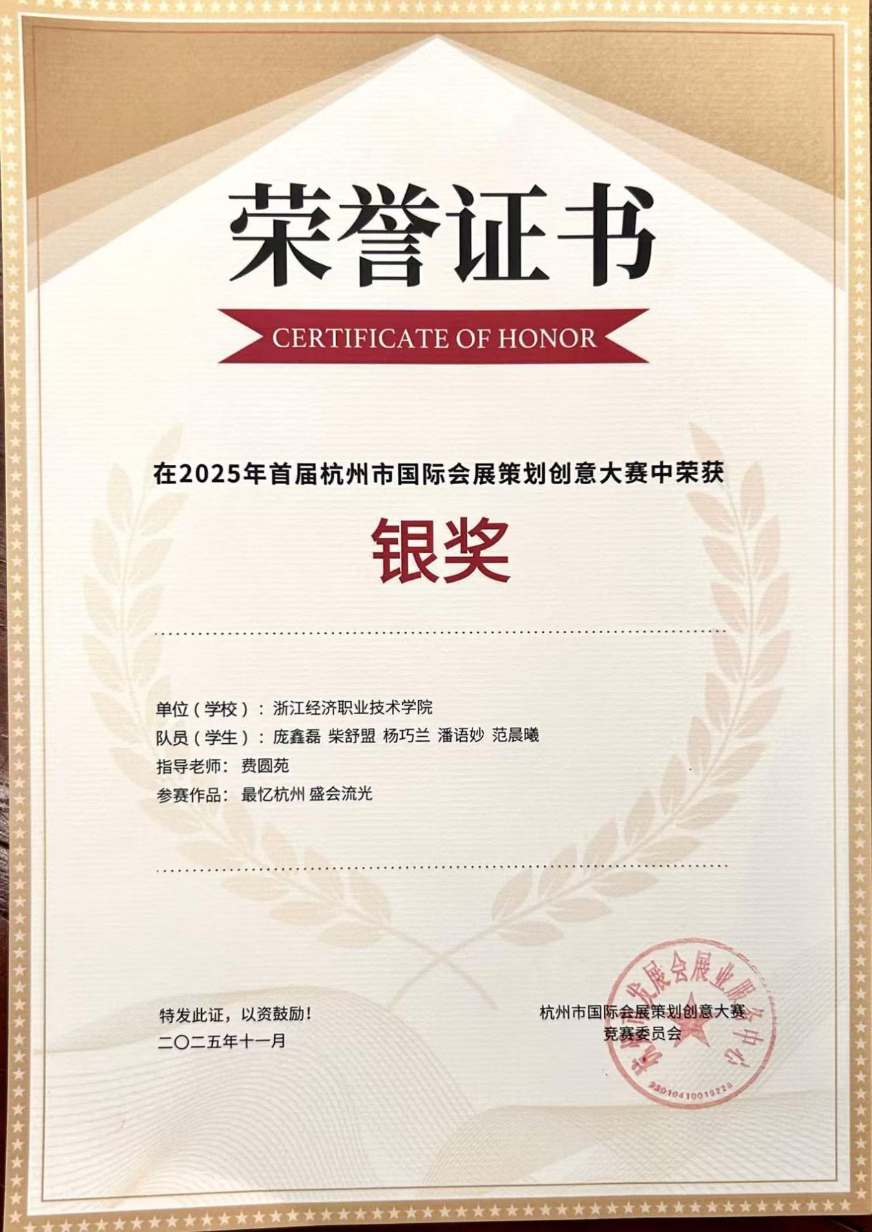 本次大赛以“创意引领未来,会展连接世界”为主题,由杭州市商务局指导,杭州市发展会展业服务中心主办,旨在推动杭州国际会展人才高地与创新策源地建设,助力打造“赛会之城”。浙江经济职业技术学院数字商贸学院作为承办单位之一,深度参与赛事组织与评审工作,展现了学院在数字会展教育与产教融合领域的专业影响力。
