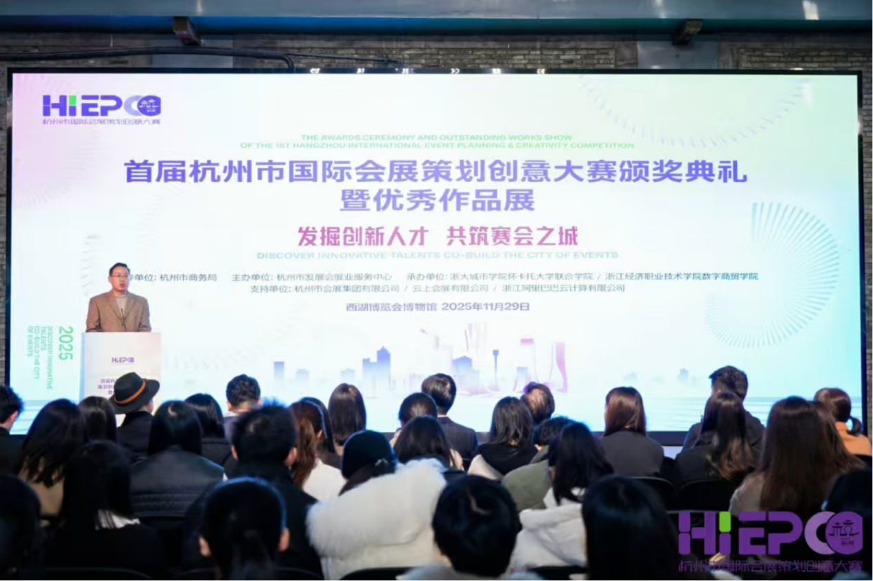 2025年11月29日上午,首届杭州市国际会展策划创意大赛颁奖典礼暨优秀作品展在西湖博览会博物馆隆重举行。浙江经济职业技术学院数字商贸学院院长汪永华作为承办单位代表受邀出席典礼并致辞,同时为荣获金奖的选手颁奖。