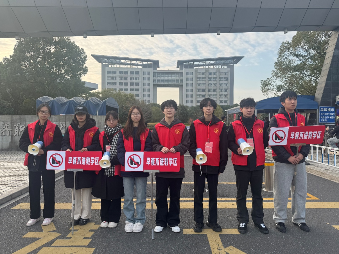 按照学校统一安排,组织志愿服务队开展“早餐不进教学区”行动,在教学区主要入口进行宣传劝导,帮助同学养成良好行为习惯。