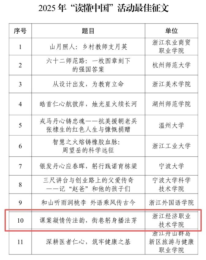 近日,在浙江省教育厅关工委近日公布的2025年“读懂中国”活动入选作品名单中,数字商贸学院P202123电商周子晗同学的作品——《课案凝情传法韵,街巷躬身播法芽》,深情讲述我院经济法教师姜吾梅的感人事迹,从全省众多优秀作品中脱颖而出,荣膺“最佳征文”称号。