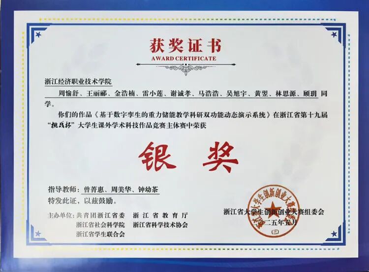 浙江省第十九届“挑战杯”大学生课外学术科技作品竞赛主体赛获银奖