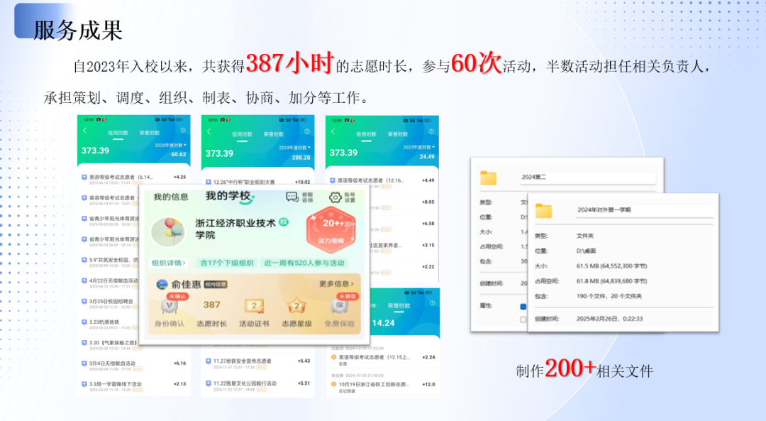 在志愿服务的战场上,她同样是活跃的身影。担任校团委青年志愿者服务中心暨青年志愿者协会副主任期间,她统筹 “中行杯” 职业规划大赛、浙江省职工创新大赛、英语等级考试等多项志愿工作,从物资分发到现场应急,每一个环节都反复推演、精益求精。