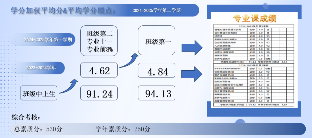对待学业,她始终以高标准严格要求自己,第一学期学分加权平均分91.24,第二学期攀升至94.13,多门核心科目超90分,稳居专业前列。