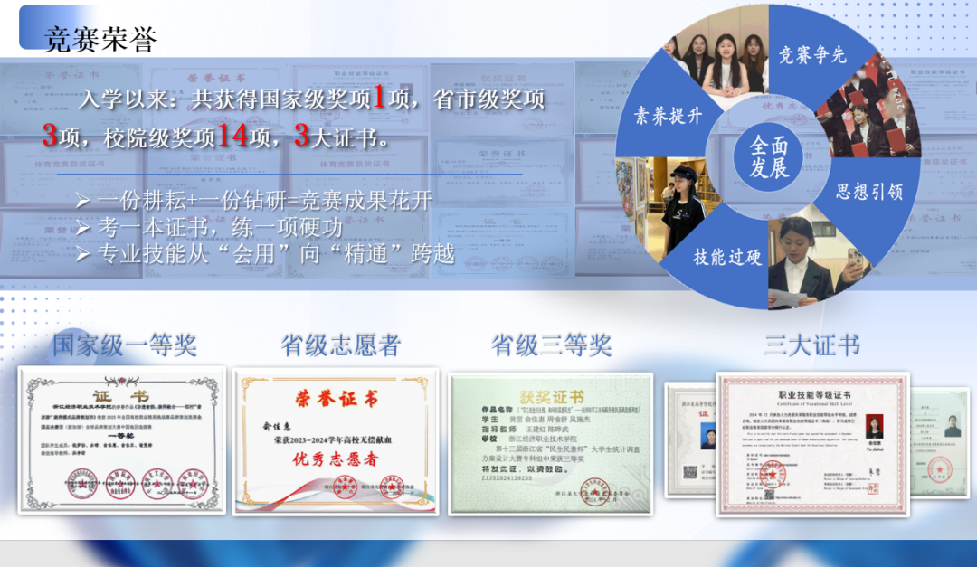 同时,她以 “考一本证书,练一项硬功” 为目标,先后拿下人力资源共享服务1+X高级证书、普通话二甲证书、浙江计算机二级证书,推动专业技能从 “会用” 向 “精通” 稳步跨越。