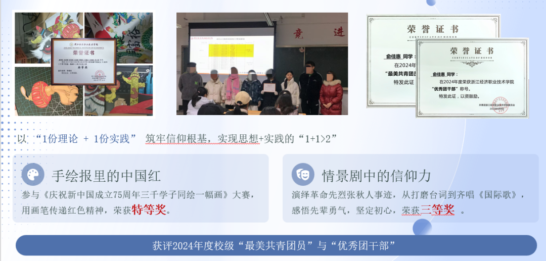 作为中共预备党员,她始终将信仰融入日常行动:与同学携手参与校《庆祝新中国成立75周年三千学子同绘一幅画》主题手绘报大赛,凭借生动画面斩获特等奖,让红色精神通过笔尖传递;站上红色情景剧舞台,演绎革命先烈张秋人事迹,在一次次打磨中深切感悟先辈为理想奋不顾身的勇气终获三等奖。投身校团委工作时,她主动担当思想引领与服务同学的重任,用扎实的行动赢得认可,获评 2024 年度校级“最美共青团员” 与 “优秀团干部”。这些经历让 “听党话、跟党走” 的信念从认知落地为实践,成为她不断前行的精神坐标。