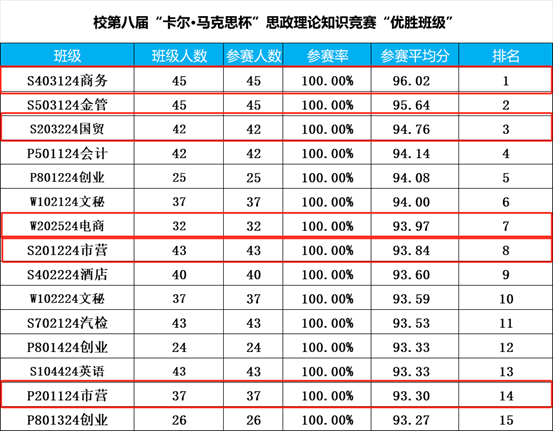 “优胜班级”共15个班,其中数字商贸学院获奖班级5个,班级参赛率达到100%,平均分超93分。