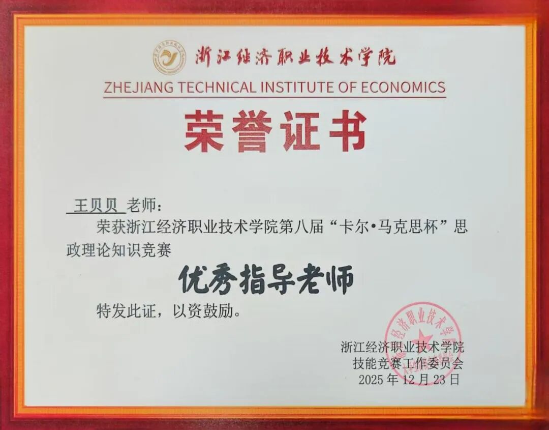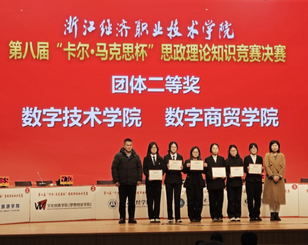 为深入学习贯彻习近平新时代中国特色社会主义思想,引导青年学生坚定理想信念、厚植家国情怀,2025年浙江经济职业技术学院“卡尔·马克思杯”思政理论知识竞赛于近日隆重举行。数字商贸学院积极组织学生备赛参赛,经过层层选拔与精心准备,学院学子在赛场上展现出扎实的理论功底和良好的精神风貌。学院获得“团体二等奖”,学生荣获个人赛一二三等奖8项,王贝贝荣获“优秀指导老师”。