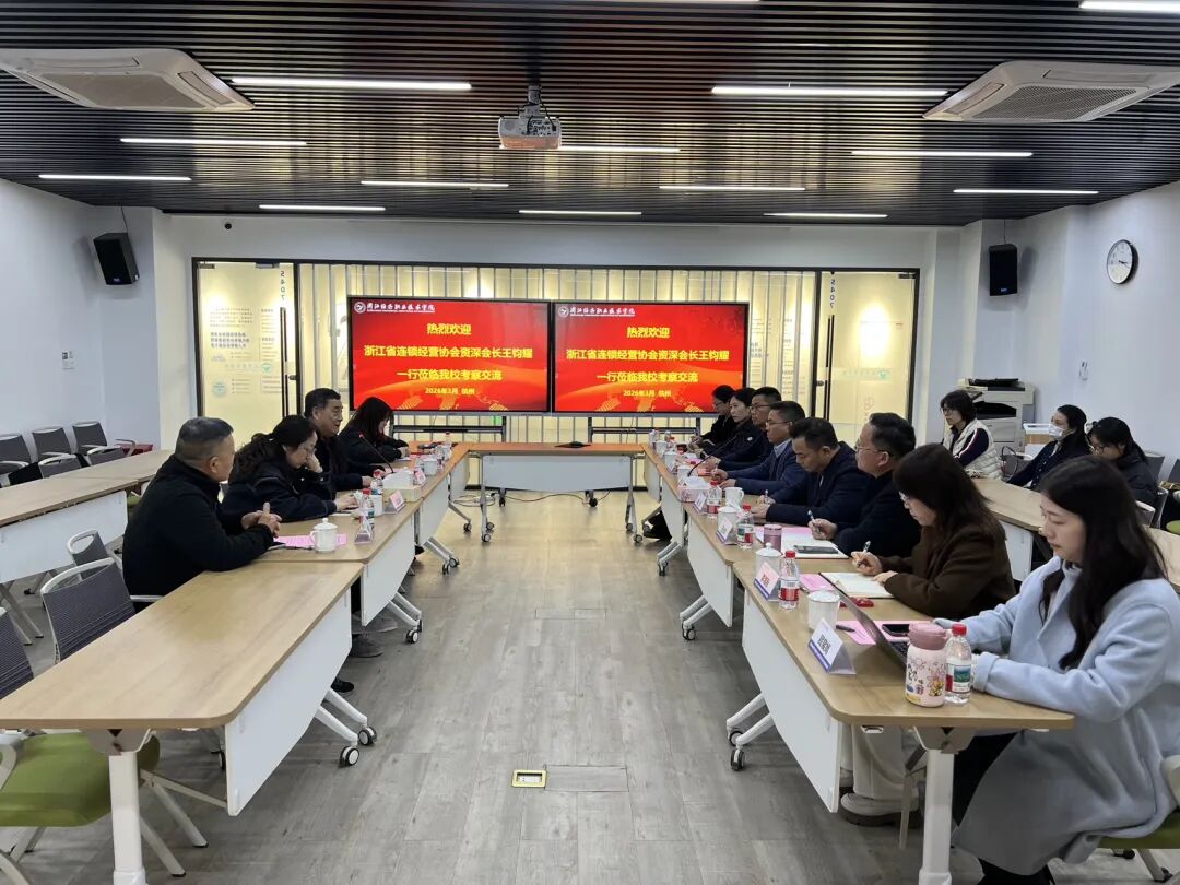 3月23日下午,浙江省连锁经营协会资深会长王钧耀一行来我校调研交流。学校党委副书记、校长柯孔林,党委委员、副校长聂华,数字商贸学院院长汪永华,智慧旅游学院副院长张星,社会合作处副处长董珊珊,以及商务管理、商务数据分析与应用专业教师参会交流。