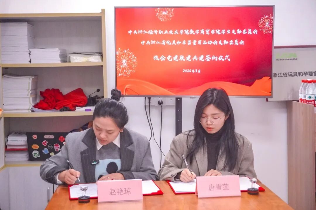 签约仪式上,浙江省玩具和孕婴童用品协会党支部与数字商贸学院跨境电商党支部、学生党支部正式达成党建联建合作。三方围绕党建活动共建、人才培养共推、就业渠道共拓等核心内容展开深入交流,明确了后续合作的具体方向。