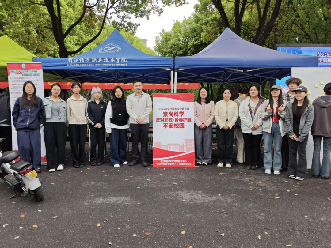 为进一步强化校园反邪教宣传教育,引导广大学生认清邪教危害、增强防范意识、树立科学理念,4月14日,数字商贸学院学生党建服务中心联合校反邪教协会,在玉屏洲生活园区开展2026全民国家安全教育日“崇尚科学反对邪教・青春护航平安校园”主题宣传活动。